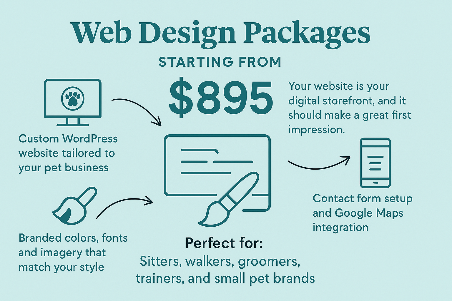Our Website Design Package gives your pet business a professional, mobile-friendly site that’s easy to use, beautifully branded, and built to attract local clients. Each site is designed to highlight your services, showcase your personality, and make booking or inquiries simple.