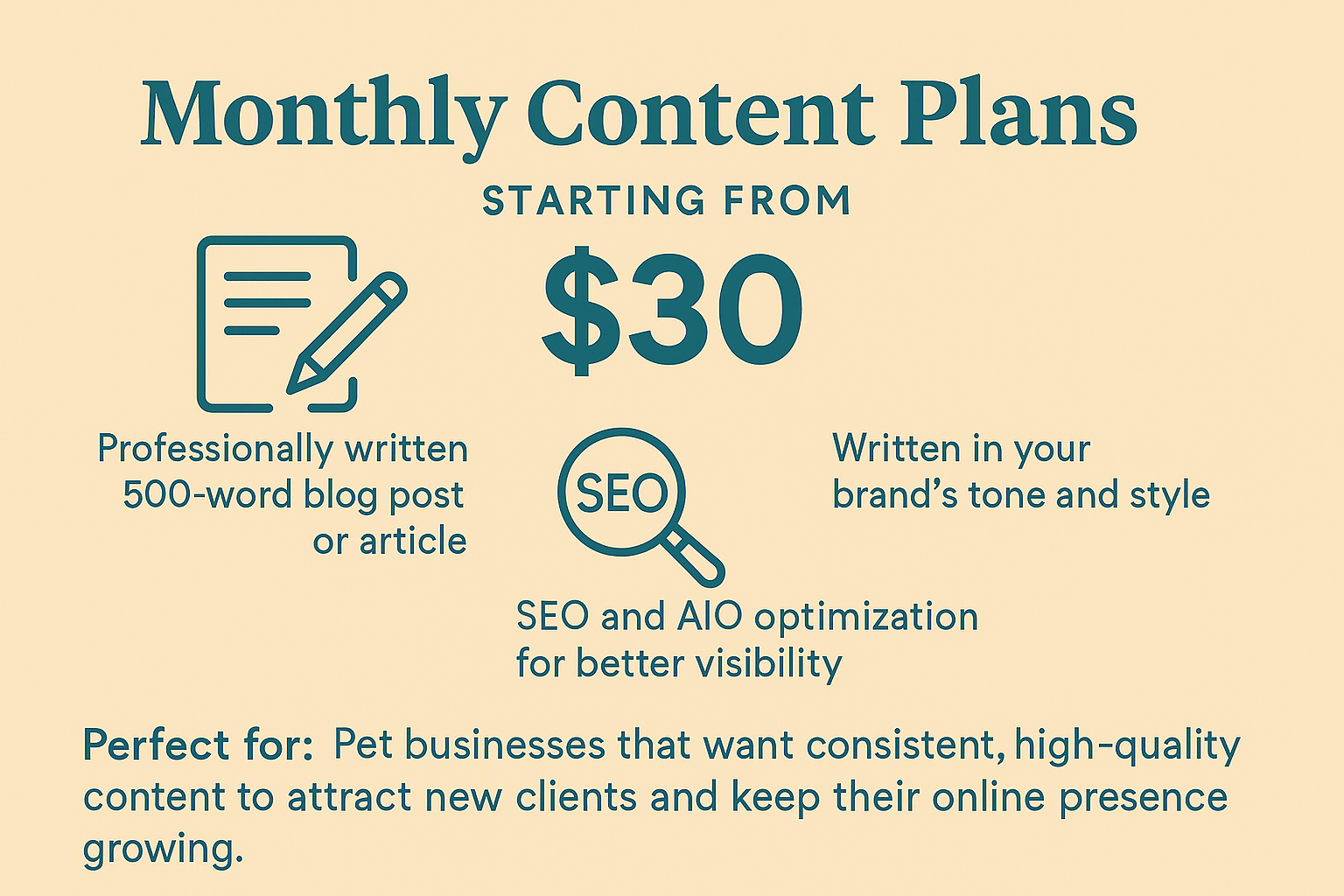 Keep your website active and your audience engaged with fresh, relevant content every month. Our Monthly Content Plans help improve your SEO, boost visibility, and build trust with pet parents in your area. Each piece is written in your unique voice, optimized for both search engines and AIO, and ready to publish.