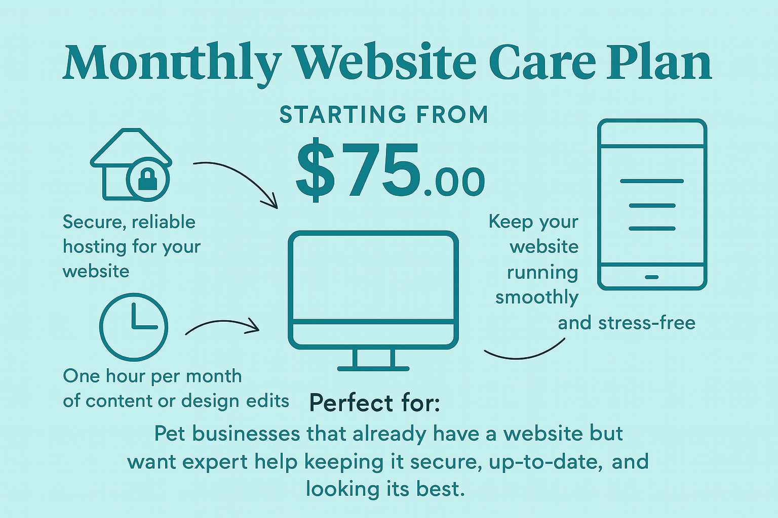 Our Website Care Plan is perfect for pet professionals who want reliable hosting, quick support, and small monthly updates handled for them. We take care of the technical details so you can stay focused on your business and your clients.