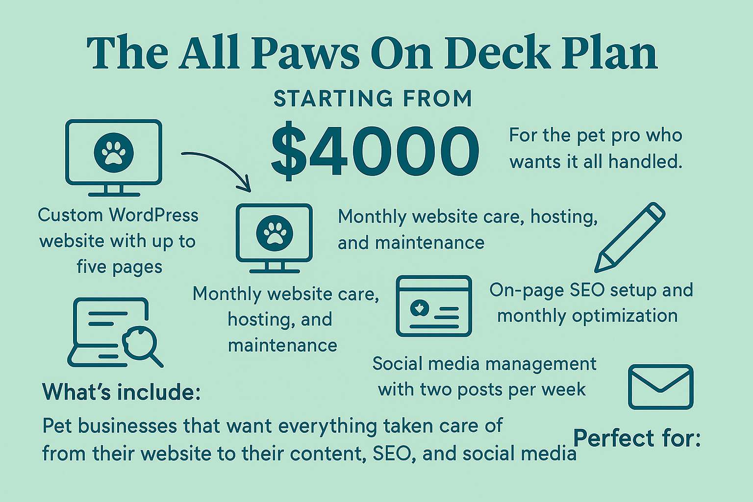 The All Paws On Deck Plan is your complete online marketing package that covers everything from your website to your social media and content. This plan is ideal for sitters, walkers, and groomers who don’t have time to worry about marketing but still want their business to look professional and stay active online all year long.